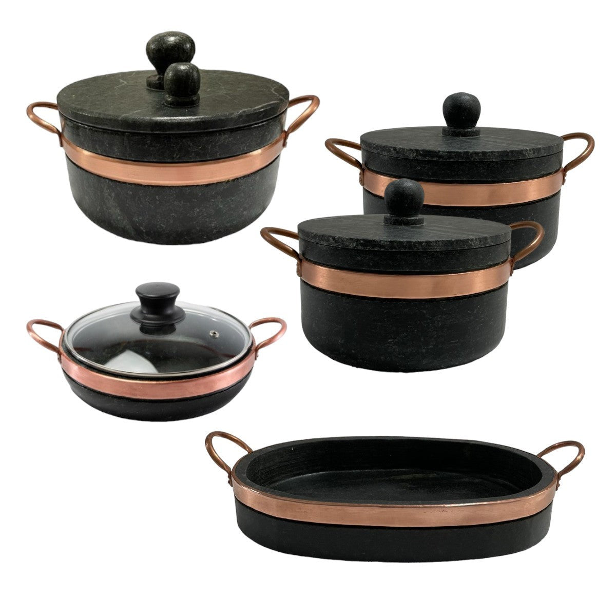 Jogo de Panelas Pedra Sabão 05 Peças - 1 Pressão 4 litros, 2 Caçarola 3 litros, frigideira 20 cm e Assadeira Grande
